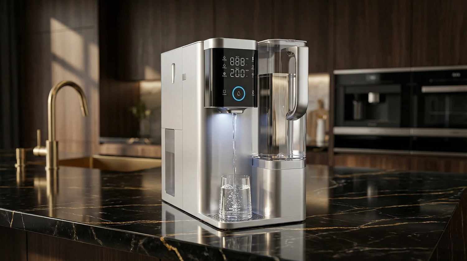 Intelligenter Wasserfilter mit Direktfluss, stufenloser Temperaturwahl und zwei hochwertigen Karaffen – für frisches, reines Wasser jederzeit.